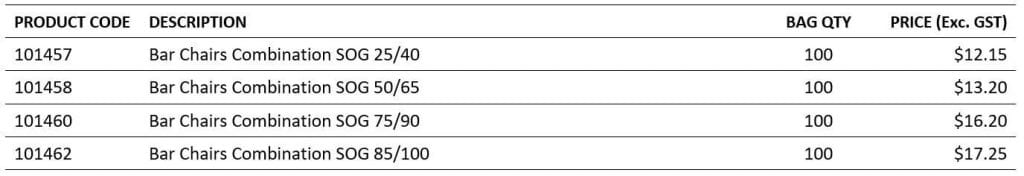 Product Description: Combination SOG Bar Chairs support mesh / bar in slab-on-ground applications. They are manufactured to provide dual-height options in the one bar chair size for increased application flexibility. As they are manufactured from plastic there is zero-risk of rust problems and their lightweight and stackable design makes handling easy.
