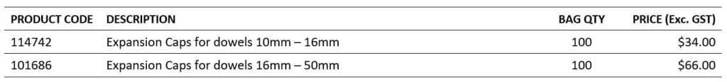 Product Details: Expansion caps are plastic caps designed to cap round dowels in concrete joints. Each cap contains an internal mould fluting which compresses with the movement of the dowel thus keeping the cap in place. The multi-fitting cap end design allows for standard diameters of round dowels to all be accommodated in just two sizes of caps.