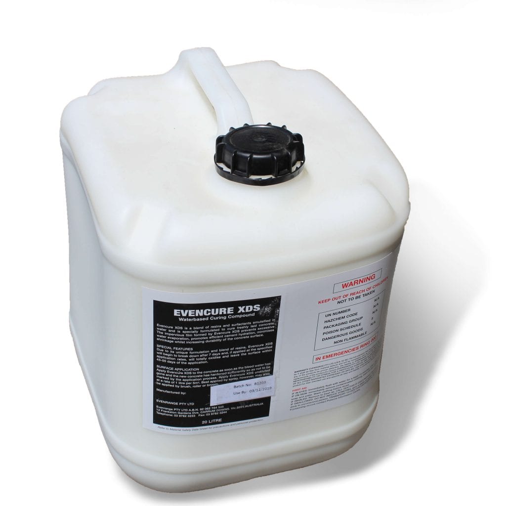 Product Details: Evencure XDS comprises a mixture of resins and surfactants emulsified in water and is specially formulated to cure freshly laid concrete. The impervious film formed by Evencure XDS prevents excessive water evaporation, promotes efficient cement hydration, minimises shrinkage whilst increasing the overall durability of the concrete surface.