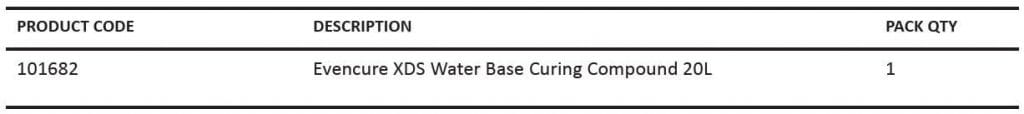 Product Details: Evencure XDS comprises a mixture of resins and surfactants emulsified in water and is specially formulated to cure freshly laid concrete. The impervious film formed by Evencure XDS prevents excessive water evaporation, promotes efficient cement hydration, minimises shrinkage whilst increasing the overall durability of the concrete surface.