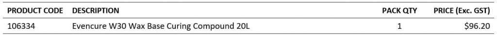 Product Details: Evencure W30 is a wax-based, sprayable curing compound formulated to cure freshly laid concrete. It is of low to medium viscosity, white pigmented emulsion of specially blended waxes. Evencure W30 meets the requirements of AS3799 for moisture preservation in liquid membrane curing compounds. After thirty to thirty-five days the continuous film formed on the concrete surface will begin to degrade due to exposure to UV light.